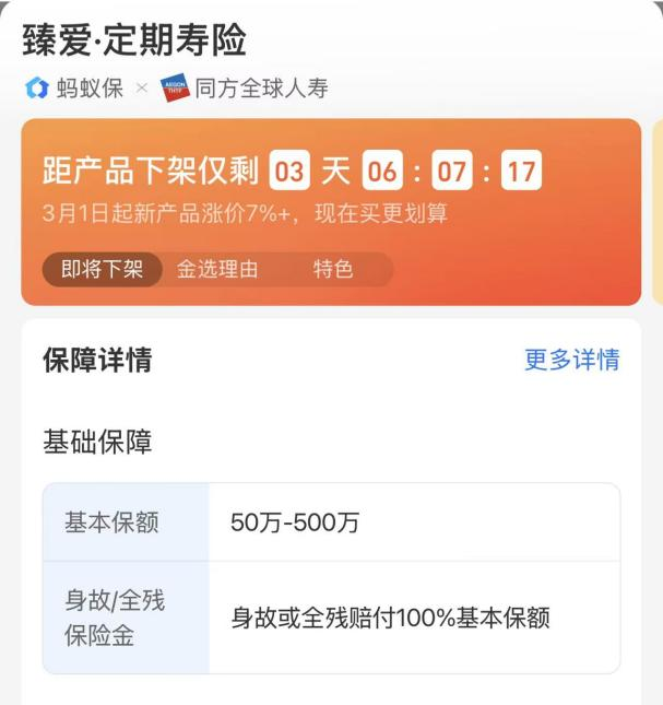 ● 本报记者 李静 春节假期刚过,保险产品货架便迎来一波集中调整。中国证券报记者从蚂蚁保、腾讯微保等互联网平台 获悉,多款热销的定期寿险产品将于2月28日下架,对应的新品将从3月1日起上市,价格将较旧产品普 遍上涨超过7%。 业内人士分析,此次定期寿险下架、调价主要受预定利率持续下行、险企风险评估更趋审慎、行业竞争 逻辑转变三大因素推动。目前留给消费者锁定低价的时间已非常有限。不过,未来定期寿险有望持续升 级,对消费者而言,产品选择仍较为丰富。业内人士提醒,保障规划应立足家庭实际需求,切勿盲目追 逐低价。 多款热销产品将停售 蚂蚁保平台信息显示,阳光人寿"全民保·定期寿险"将于2月28日下架,新产品将于3月1日上市,价格将 较旧产品上涨约7.2%。蚂蚁保客服表示,3月1日上线的产品将在权益、保额及保费方面有所调整。同 平台在售的同方全球人寿"臻爱·定期寿险"也将在2月28日下架,新产品的涨价幅度亦超过7%。 腾讯微保平台上的同方全球人寿"护身福·定期寿险(鹅民专区版)"同样将于2月28日下架。值得注意的 是,该产品与蚂蚁保平台的"臻爱·定期寿险"实为同款产品,均为"同方全球'臻爱2026'"。腾讯微保客服 向 ...
