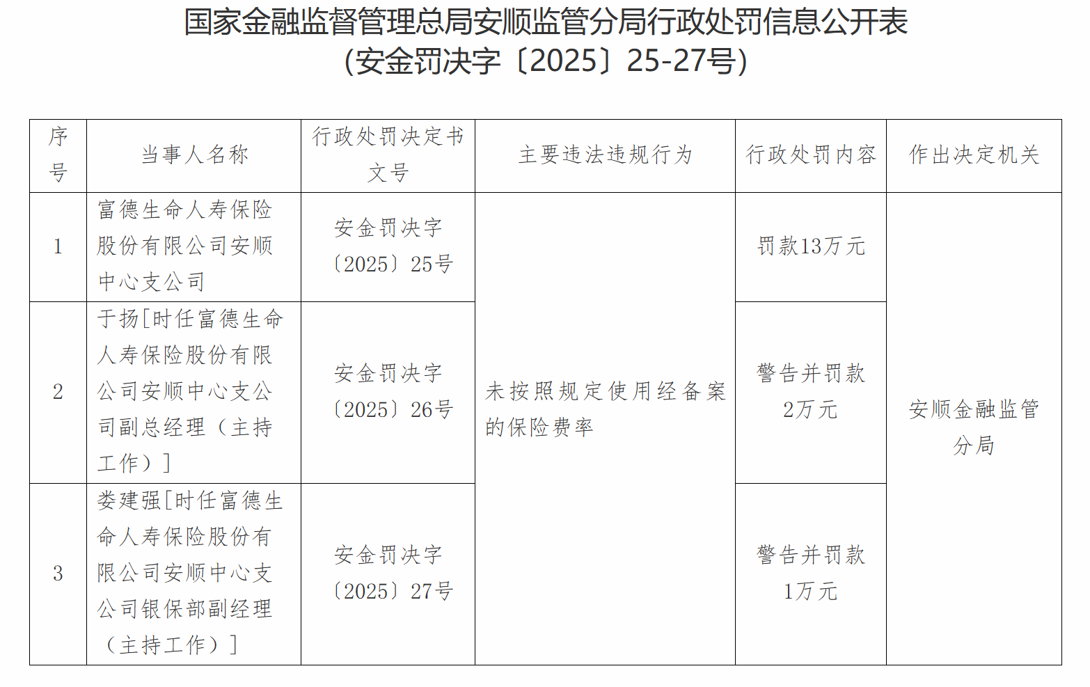 | 序 | 当事人名称 | 行政处罚决定书 | 主要违法违规行为 | 行 | | --- | --- | --- | --- | --- | | 를 | | 文号 | | | | | 富德生命人寿保险 | 安金罚决字 | | | | l | 股份有限公司安顺 | (2025) 25号 | | | | | 中心支公司 | | | | | | 于扬[时任富德生命 | | | | | | 人寿保险股份有限 | 安金罚决字 | | | | 2 | 公司安顺中心支公 | (2025) 26号 | 未按照规定使用经备案 | | | | 司副总经理(主持 | | 的保险费率 | | | | 工作)] | | | | | | 娄建强 时任富德生 | | | | | | 命人寿保险股份有 | | | | | 3 | 限公司安顺中心支 | 安金罚决字 | | | | | | (2025) 27号 | | | | | 公司银保部副经理 | | | | | | (主持工作) | | | | 时任富德生命人寿安顺中心支公司副总经理于扬、时任富德生命人寿安顺中心支公司银保部副经理娄建强,对上述违规行为负有责任,受到警告,并分别被 罚款2 ...