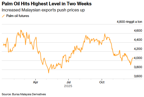 智通财经APP获悉,棕榈油价格连续第四个交易日上涨,并在马来西亚产品需求增加的支撑下触及两周 以来最高水平。 根据Intertek Testing Services的数据,在12月的前25天,第二大棕榈油生产国马来西亚的出口量环比增长 了1.6%。印度是最大买家,进口了279,550吨,较上月同期增长了66%。 "随着节日季节需求赶上,出口势必会增加," Kaleesuwari Intercontinental的交易和对冲策略主管 Gnanasekar Thiagarajan表示。预计2026年2月农历新年和斋月前的需求将推高价格。 然而,他补充说,马来西亚令吉走强可能会限制涨幅。马来西亚令吉连续第三天走强,预计将创下四年 半以来的新高,这降低了这一热带大宗商品对海外买家的吸引力。 ...