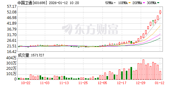 Core Viewpoint - China Satcom's stock price has reached a historical high, showing a continuous upward trend with 10 trading days in the past month where the stock price set new records [1] Company Summary - As of 09:38, China Satcom's stock is up 6.06%, priced at 51.95 yuan, with a trading volume of 60.74 million shares and a transaction amount of 3.093 billion yuan, resulting in a turnover rate of 1.44% [1] - The latest total market capitalization of the company is 219.457 billion yuan, with the circulating market capitalization also at 219.457 billion yuan [1] - The company's Q3 report indicates a total operating revenue of 1.852 billion yuan for the first three quarters, representing a year-on-year increase of 5.35%, while net profit is 286 million yuan, showing a year-on-year decline of 40.58%, with basic earnings per share at 0.0676 yuan and a weighted average return on equity of 1.82% [1] Industry Summary - The defense and military industry, to which China Satcom belongs, has an overall increase of 2.89%, with 124 stocks rising in price, including three stocks that hit the daily limit [1] - Among the stocks that declined, *ST Aowei, Northern Long Dragon, and Great Wall Military Industry experienced the largest drops of 4.13%, 2.93%, and 2.73%, respectively [1] - As of January 9, the latest margin trading balance for China Satcom is 2.461 billion yuan, with a financing balance of 2.455 billion yuan, reflecting an increase of 259 million yuan over the past 10 days, which is a month-on-month growth of 11.77% [1]