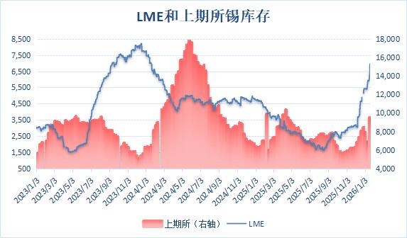 伦敦金属交易所(LME)公布数据显示,上周伦锡库存整体有所回升,本周库存增幅明显,最新库存 水平为6960吨,刷新两年新高。 上海期货交易所公布数据显示,1月16日当周,沪锡库存大幅累积,周度库存增加37.69%至9549吨,增 至近九个月新高。 注:一般来说,国内外交易所库存不断下降将对期价形成支撑,反之,则对期价有所利空。 2023年以来LME和上期所锡库存对比 | 以下为2026年1月以来LME和上期所锡库存数据:(单位:吨) | | --- | | 日期 | LME | 上期所 | | --- | --- | --- | | 2026/1/20 | 6, 960 | | | 2026/1/19 | 6, 440 | | | 2026/1/16 | 5, 935 | 9, 549 | | 2026/1/15 | 5, 925 | | | 2026/1/14 | 5, 930 | | | 2026/1/13 | 5, 930 | | | 2026/1/12 | 5, 905 | | | 2026/1/9 | 5, 415 | 6, 935 | | 2026/1/8 | 5, 405 | | | 2026/ ...