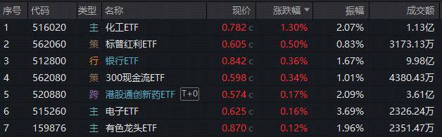 化工板块强势反超领涨,电解液、固态电池等多概念发力,化工ETF(516020)午后一度上探逾1.8%,场内放量收涨1.3%。消息面,电解液行业量价齐 升,头部电解液企业订单火爆,批量斩获长协大单。 银行再度彰显防御性,全市场规模最大银行ETF(512800)早盘自水下拉起,午后维持红盘窄震,场内逆市收涨0.36%收复5日、10日线。近期A股走势震 荡,低位补涨及防守型配置机会显现,银行板块配置或正当时。 周四(11月27日),大盘全天冲高回落,沪指微涨0.29%报收3875.26点,创业板指回吐逾2%收跌0.44%。个股整体涨跌参半,全市场成交额1.72万亿元,连 续2日小幅缩量。 | 序号 代码 | | ਦੇ ਵਿੱਚ ਹੈ 名称 | 现价 | 涨跌幅 | 振幅 | 成交额 | | --- | --- | --- | --- | --- | --- | --- | | 1 | 516020 | 主 化工ETF | 0.782 c | 1.30% | 2.07% | 1.13亿 | | 2 | 562060 | 策 标普红利ETF | 0.605 c | 0.50% | 0.83% | 3173.13万 | ...