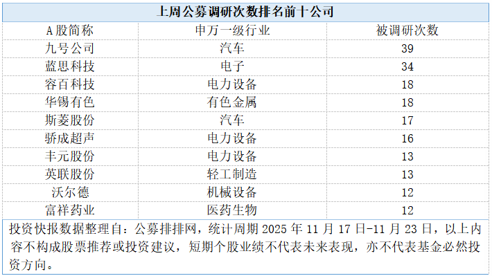 记者 杨帆 尽管近期A股市场整体表现震荡,但公募机构依旧维持较高的调研热情。投资快报记者从公募排排网数 据显示梳理出,上周(2025年11月17日-11月23日)共有128家公募机构积极参与A股调研活动,覆盖22 个申万一级行业中的118只个股,合计调研次数达513次,展现出公募机构对市场结构性机会的持续挖 掘。 33只个股获高频调研 从个股调研热度来看,上周33只个股获得公募机构调研关注,被调研次数均不少于5次,其中13只个股 更是被调研不下10次,前十名被调研次数均不少于12次。 汽车行业成调研"黑马",九号公司领跑个股榜单。汽车行业个股九号公司被调研39次成为上周最受公募 青睐的标的,博时基金、华夏基金、汇添富基金等头部公募机构均出现在调研名单中。公募机构重点关 注国补对公司业务的实际影响,以及明年电动两轮车业务的发展展望。该行业另一只个股斯菱股份同样 表现亮眼,不仅以17次调研跻身前十,更在上周逆势大涨5.97%,在调研热度前十个股中涨幅领跑,其 与战略投资公司的产业合作方向成为公募机构关注焦点。 电力设备多点开花,3只个股入围前十。电力设备行业延续此前关注度,共有3只个股进入调研热度前 十:容百科技 ...