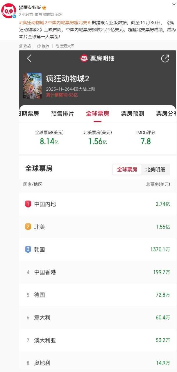 IT之家 12 月 1 日消息,据猫眼专业版数据,截至 11 月 30 日,《疯狂动物城 2》上映首周,中国内地票房报 收 2.74 亿美元(IT之家注:现汇率约合 19.4 亿元人民币),超越北美票房成绩,成为本片全球第一大票仓。 | > | g 票房明细 | | C | | --- | --- | --- | --- | | 疯狂动物城2 | | | | | 2025-11-26中国大陆上映 | 器计量房19.63亿 | | | | 胡票房 | 预售排片 全球票房 | 票房预测 | 票房分? | | 全球票房(美元) | 北美票房(美元) | IMDb评分 | | | 8.14亿 | 1.56亿 | 7.8 | | | 全球票房 | | 全球票房 北美明细 | | | 国家/地区 | | | 总票房(美元) | | 中国内地 | | | 2.74亿 | | 2 北美 | | | 1.56亿 | | 3 韩国 | | | 1370.1万 | | 4 中国香港 | | | 199.7万 | | 5 德国 | | | 72.8万 | | 6 意大利 | 60.4万 | | --- | --- | | 7 澳大利 ...