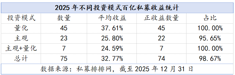 据私募排排网统计,全年有业绩展示的75家百亿私募平均收益达32.77%,其中74家实现正收益,占比 98.67%。从收益分布来看,18家收益在20%以内,45家介于20%至50%之间,另有11家收益超过50%。远信投 资、复胜资产、望正资产等百亿私募表现较为突出。 | | | 2025年不同投资模式百亿私募收益统计 | | | | --- | --- | --- | --- | --- | | 投资模式 | 数量 | 平均收益 | 正收益数量 | 占比 | | 量化 | 45 | 37. 61% | 45 | 100. 00% | | 主观 | 23 | 25. 80% | 22 | 95. 65% | | 主观+量化 | / | 24. 59% | | 100. 00% | | 总计 | 75 | 32.77% | 74 | 98. 67% | | | | 数据来源:私募排排网,截至2025年12月31日 | | | 2025年百亿私募整体交出亮眼成绩单。 量化私募成为亮点。在45家有业绩的百亿量化私募中,平均收益高达37.61%,全部实现正收益,显著高于 百亿私募整体水平。从收益分布来看,4家收益在20% ...