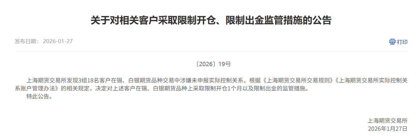 1月27日,上海期货交易所发布公告,发现3组18名客户在锡、白银期货品种交易中涉嫌未申报实际控制关系,根据《上海期货交易所交易规则》《上海期货 交易所实际控制关系账户管理办法》的相关规定,决定对上述客户在锡、白银期货品种上采取限制开仓1个月以及限制出金的监管措施。 上证报中国证券网讯(记者 费天元)1月27日,上海期货交易所发布公告,发现3组18名客户在锡、白银期货品种交易中涉嫌未申报实际控制关系,根据 《上海期货交易所交易规则》《上海期货交易所实际控制关系账户管理办法》的相关规定,决定对上述客户在锡、白银期货品种上采取限制开仓1个月以及 限制出金的监管措施。 ...