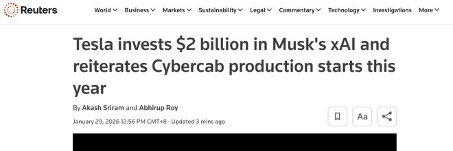 特斯拉 2025Q4 净利润 8.4 亿美元同比降 61%,同时20 亿美元加码 xAI