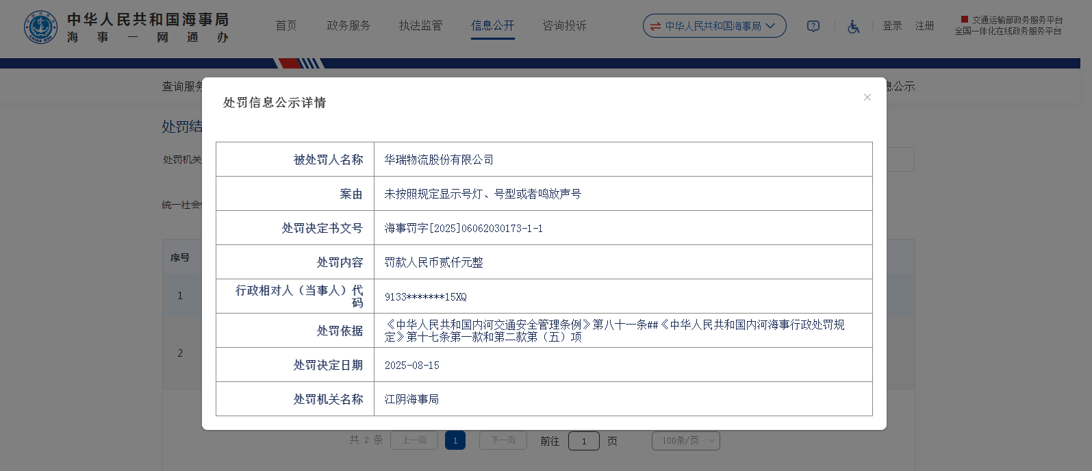 齐鲁晚报·齐鲁壹点记者于中国海事局监管信息公开栏获悉,8月15日,华瑞物流股份有限公司(下称"华瑞物流")收行政处罚决定书,处罚决定书文号为海 事罚字[2025]06062030173-1-1。 | 中华人民共和国海事局 | 200 通 办 | 首页 | 政务服务 | 执法监管 信息公开 | | 咨询投诉 | | 一中华人民共和国际 | | --- | --- | --- | --- | --- | --- | --- | --- | --- | | | | 1111 | | | | | | | | 查询服务 | | 处罚信息公示详情 | | | | | | | | 处罚结 | | | | | | | | | | 处罚机关 | | | 被处罚人名称 | 华瑞物流股份有限公司 | | | | | | 统一社会 | | | 案由 | 未按照规定显示号灯、号型或者鸣放声号 | | | | | | | | | 处罚决定书文号 | 海事罚字[2025]06062030173-1-1 | | | | | | 序号 | | | 处罚内容 | 罚款人民币贰仟元整 | | | | | | 1 | | 行政相对人(当事人)代 | ...