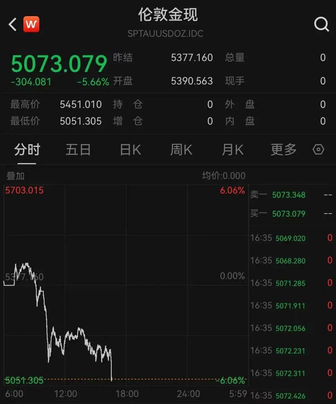 【大河财立方消息】1月30日,现货黄金、白银持续下挫。截至发稿,现货黄金跌超5%,失守5100美元/盎司关口。现货白银跌超10%,报103.518美元/盎 司。纽约期银跌超7%。 | < W | 伦敦金现 | | | | | | --- | --- | --- | --- | --- | --- | | | SPTAUUSDOZ.IDC | | | | | | 507 3 079 F2 | | 5377.160 | | 品量 | 0 | | -304.081 -5.66% 开盘 | | 5390.563 | | 现手 | 0 | | 最高价 5451.010 | 持 仓 | 0 | | 外 盘 | 0 | | 最低价 5051.305 | 增 仓 | 0 | 内 | | 0 | | 分时 五日 | EK | 居K | FK | 更多 | | | 管加 | | | 均价:0.000 | | | | 5703.015 | | | 6.06% 註一 | 5073.348 | | | | | | | 2- 5073.079 | | | | | | | 16:35 5069.020 16:35 5068.280 | 0 ...