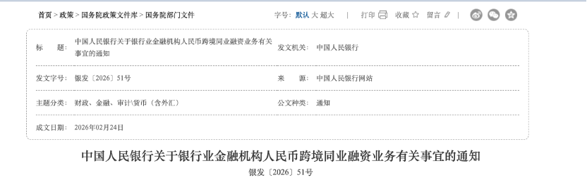 21世纪经济报道记者 郭聪聪 2月26日,中国人民银行发布《关于银行业金融机构人民币跨境同业融资业务有关事宜的通知》(下称《通知》),自 发布之日起实施。《通知》旨在规范境内银行业金融机构与境外机构开展人民币跨境同业融资业务,支持人民币离岸 市场发展,提升跨境资本流动管理的科学性和透明度。 人民币跨境同业融资作为境内银行向离岸市场提供流动性、促进人民币跨境使用的重要渠道,涵盖账户融资、债券回 购等多种形式,是连接在岸与离岸市场的重要桥梁。 《通知》管理逻辑同此前出台的境外贷款、境外放款等措施一脉相承,是对全口径跨境融资宏观审慎管理的有效补 充。文中明确将银行业金融机构人民币跨境同业融资净融出余额与其资本水平、资金实力挂钩,并引入宏观审慎调节 参数,根据市场形势进行逆周期调节。同时,按照"实质重于形式"原则,将各类跨境同业融资业务纳入统一管理。 适用机构:明确资质要求,农村金融机构有条件参与 值得关注的是,《通知》适用对象为境内依法设立的具备国际结算业务能力的银行,但对农村金融机构作出差异化安 排:原则上不得开展人民币跨境同业融出业务,但符合一定资质的机构可审慎参与。 中国人民银行表示,《通知》实施后人民币跨境 ...