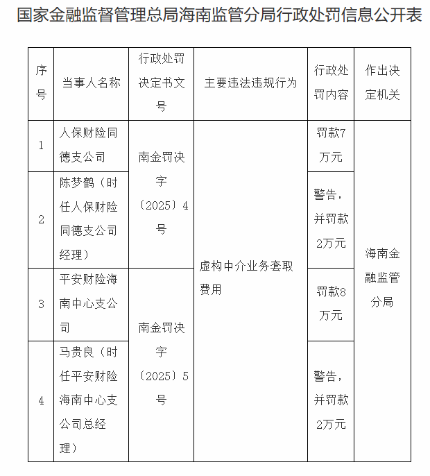 中国经济网北京12月12日讯 国家金融监督管理总局海南监管分局今日发布行政处罚信息公开表(南金 罚决字〔2025〕4号)。 以下为原文: | 序 | | 行政处罚 | | 行政处 | 作出决 | | --- | --- | --- | --- | --- | --- | | 름 | 当事人名称 | 决定书文 | 主要违法违规行为 | 罚内容 | 定机关 | | | | 름 | | | | | 1 | 人保财险同 | | | 罚款7 | | | | 德支公司 | 南金罚决 | | 万元 | | | | 陈梦鹤(时 同德支公司 | 字 | | 整告, | | | | 任人保财险 | (2025) 4 | | | | | 2 | | 름 | | 并罚款 | | | | | | | 2万元 | | | | 经理) | | 虚构中介业务套取 | | 海南金 | | | 平安财险海 | | 费用 | 罚款8 | 融监管 | | 3 | 南中心支公 | | | | 分局 | | | | | | 万元 | | | | 司 | 南金罚决 | | | | | | 马贵良(时 | 守 | | | | | | 任平安财险 | (20 ...