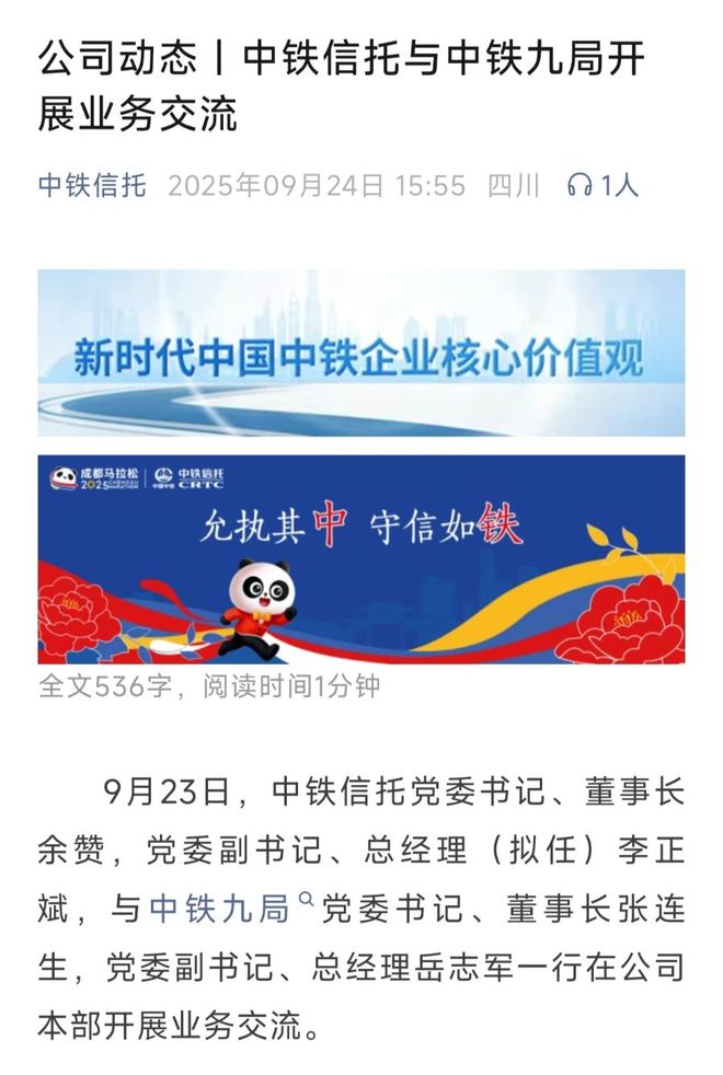 南方财经全媒体记者 林汉垚 正式担任中铁信托副总经理不足一年,李正斌被拟任中铁信托总经理。 近日,中铁信托官微消息显示,已拟任李正斌为其公司总经理。 据该公司官微,9月23日,中铁信托党委书记、董事长余赞,党委副书记、总经理(拟任)李正斌,与 中铁九局党委书记、董事长张连生,党委副书记、总经理岳志军一行在公司本部开展业务交流。 据了解,在拟任总经理前,李正斌于2024年9月23日正式获批担任中铁信托副总经理。 中铁信托控股股东中国中铁股份有限公司(A+H)是特大型央企集团,是全球最大建筑工程承包商之一, 业务范围涵盖了几乎所有基本建设领域。 简历显示,李正斌历任中铁二局机筑处会计员、助理会计师、会计师、财务部副部长,重庆垫忠高速公 路有限公司财务总监,中铁信托财务中心副总经理、总经理,中铁信托总会计师,中铁信托党委委员、 工会主席、职工董事等职。 另外,据证券时报报道,中铁信托前任总经理陈赤已于今年4月转任中铁城投、中铁开投专职外部董 事。 履历显示,陈赤历任西南财经大学政治经济学教研室副主任,四川省信托投资公司峨眉山办事处总经理 助理,衡平信托有限责任公司总经理助理。中铁信托副总经理、董事会秘书、总经理等职 ...
