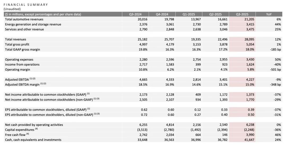美东时间10月22日收盘后,特斯拉(NASDAQ:TSLA)公布了2025年第三季度财报。 营收创新高但利润下滑近三成 财报数据显示,今年三季度,特斯拉营收为281亿美元,同比增长12%,但净利润下滑29%至17.7亿美元(非美国通用会计准则下)。对于三季度营收的增长 原因,特斯拉方面称,主要受到汽车交付量、能源生产和存储业务及服务业务增长驱动。 按照业务划分来看,今年三季度,特斯拉核心汽车业务营收增长6%,至212亿美元,去年同期为200亿美元;能源发电与储能业务营收大增44%至34.2亿美 元,三季度装机量达12.5吉瓦时;包括车辆维修在内的服务和其他业务,营收为34.75亿美元,同比增长25%。 | FINANCIAL SUMMARY | | --- | | ($ in millions, except percentages and per share data) | Q3-2024 | Q4-2024 | Q1-2025 | Q2-2025 | | --- | --- | --- | --- | --- | | Total automotive revenues | 20,016 | 19,798  ...