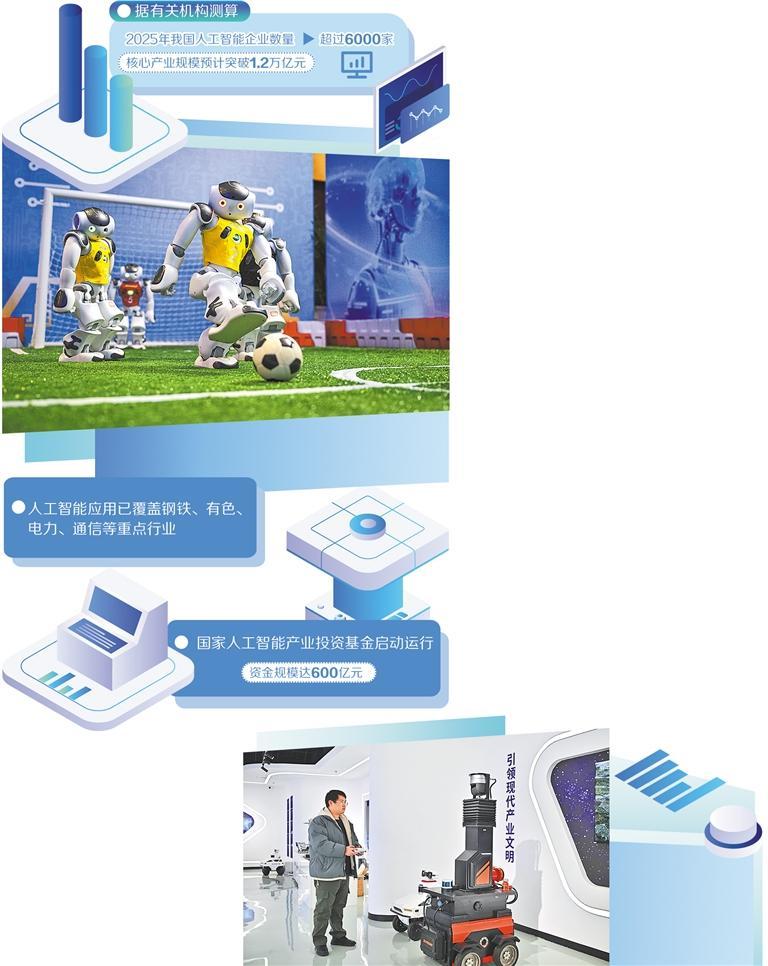(左上)在武汉,人形机器人现场表演踢足球。 新华社记者 肖艺九摄 (右下)在位于京津中关村科技城的天津新松智能科技有限公司,工作人员正操控一台矿井巡查机器人。 新华社记者 孙凡越摄 全球人工智能技术迭代创新按下"快进键",与各行业各领域的融合应用持续拓展深化。近日,工业和信息化 部等8部门发布《"人工智能+制造"专项行动实施意见》(下称《实施意见》),加快推进人工智能技术在制 造业中融合应用,培育新质生产力,全方位、深层次、高水平赋能新型工业化。 专家认为,以大模型为代表的新一代人工智能技术加速突破,为制造业转型升级提供了前所未有的历史机 遇。推动人工智能与制造业深度融合,是重塑制造业竞争优势、加快建设制造强国的关键一招,更是培育新 质生产力、构建现代化产业体系的战略举措。 重塑产业竞争格局 "当前,人工智能技术正对制造业生产模式和经济形态产生深远影响。"中国互联网络信息中心主任、党委书 记刘郁林表示,《实施意见》的发布标志着我国人工智能在制造业的应用正从局部试点向全面赋能的新阶段 迈进。 据有关机构测算,2025年我国人工智能企业数量超过6000家,核心产业规模预计突破1.2万亿元。AI手机、AI 电脑、A ...