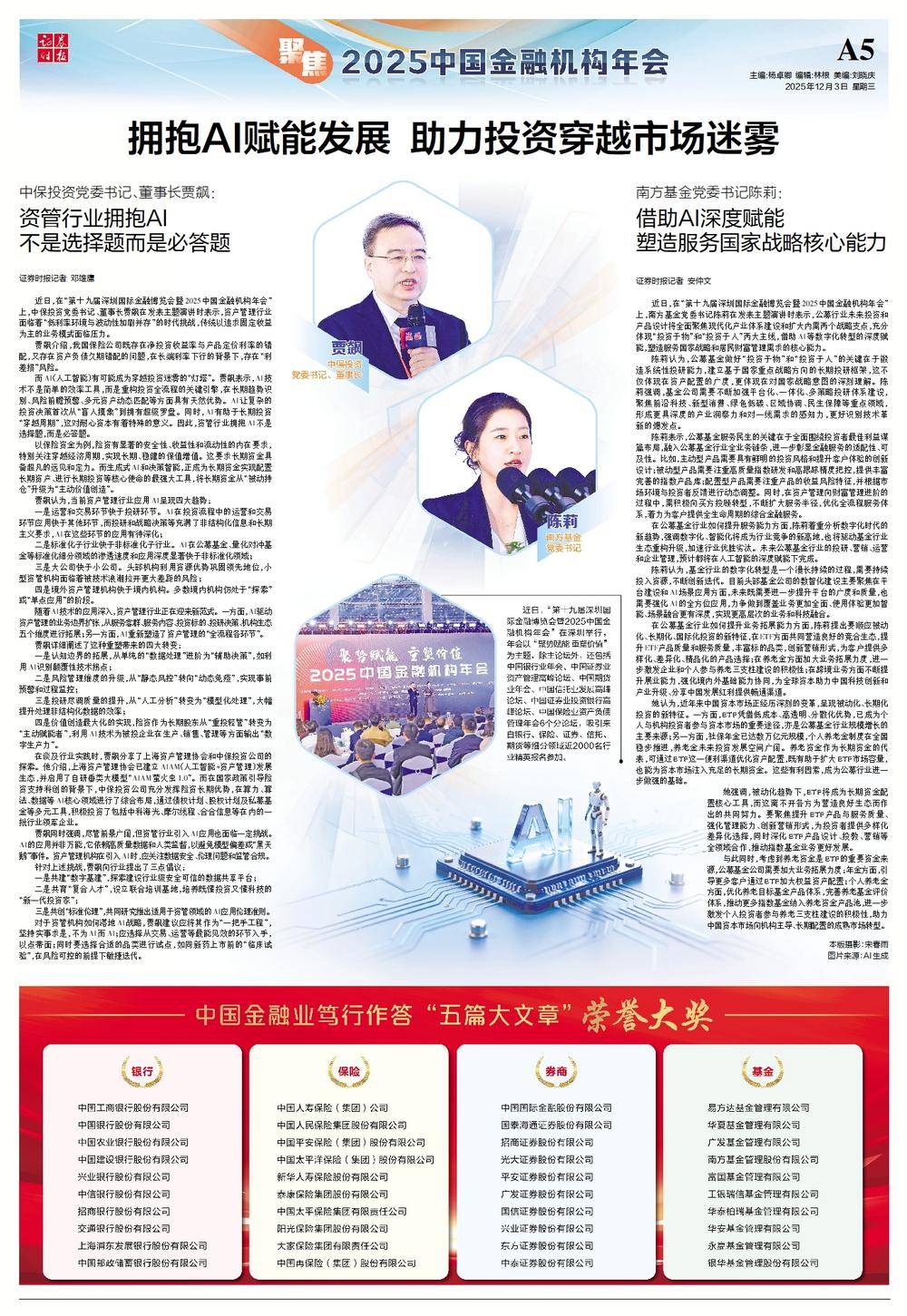 中国 Gamin A GE 拥抱Al赋能发展 助力投资穿越市场迷雾 中保投资党委书记、董事长贾飙: 资管行业拥抱Al 不是选择题而是必答题 证券时报记者 双楼商 近日,在"第十九届深圳国际金融博览会暨2025中国金融机构年会 上 ,中保投资党委书记 ,董事长贾纲在 发表主题演讲 时未示 , 资产管理行业 面临着 *係利率环境与波动性加剧并存 "的时代挑战 ,传统以追求固定收益 为主的业务模式面临压力。 需要介绍,我国保险公司既存在净投资收益率与产品定价利军的错 配,又存在资产负债久期错配的问题,在长端利率下行的背景下,存在"利 美揚"與陰 面 AI(人工智能)有可能成为穿越投资迷想的"灯答"。需积来示,将 术不是简单的效率工具,而是重构投资金流程的关键引擎,在长期趋势识 剧、风险前瞻预楚、多元溶产动态匹配等方面具有天然优势。Ni让复杂的 投资决策首次从"富人摸像"到境有趣级罗盘。同时,NI有助于长期投资 穿越用期",这对耐心资本有看特殊的意义。因此,资智行业拥抱 11不是 法提盟 而易必签题 以保险资金为例,陰资有显著的安全性、收益性和流动性的内在要求 特别关注穿越经济周期,实现长期、稳健的保值增值。这要求长 ...
