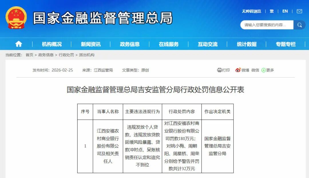 | 国家金融监督管理总局 | | | | | 无障碍测资 EN | | --- | --- | --- | --- | --- | --- | | 请输入您要搜索的内容 .. | | | | | O | | 个 机构概况 新闻资讯 政务信息 在线服务 | | | | 互动交流 | 统计数据 专题专栏 | | 当前位置:首页 > 政务信息 > 行政处罚 > 派出机构 | | | | | | | 发布时间:2026-02-25 目打印 6 微博 微信 ()更多 | 来源:江西监管局 | 文章类型:原创 | | | | | 国家金融监督管理总局吉安监管分局行政处罚信息公开表 | | | | | | | 当事人名称 | 序号 | 主要违法违规行为 | 行政处罚内容 | 作出决定机关 | | | 对】西安福农村商 | 江西安福农 村商业银行 股份有限公 | 违规发放个人贷 款、违规发放贷款 款冲时点、呆账核 | 业银行股份有限公 司罚款180万元; 对姚小梅、周朝 | 国家金融监督 管理总局吉安 | | | 延缓风险暴露、贷 | 1 | | | | | | 监管分局 | 司及相关责 | | 阳、周星桥、周荣 | | | ...