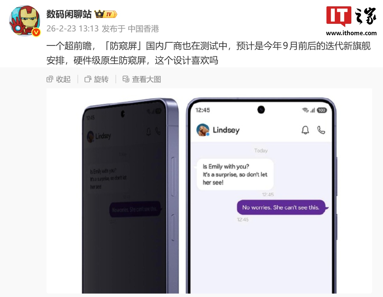 消息称「防窥屏」国内厂商测试中,预计今年 9 月前后的迭代旗舰安排
