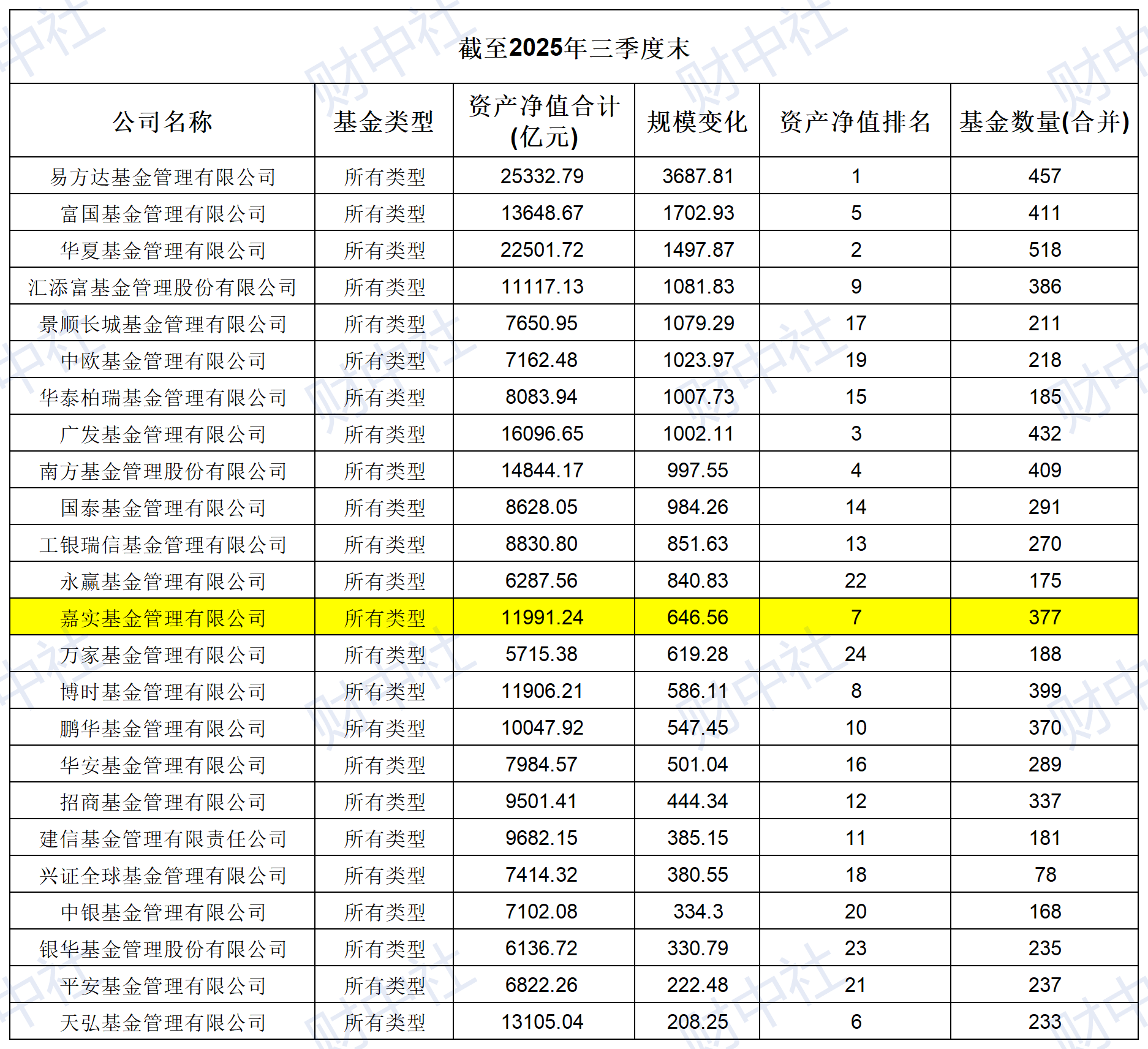 Core Viewpoint - As of the end of Q3 2025, the company has a net asset value of approximately 1.2 trillion yuan, ranking seventh in the industry, but its growth rate is lagging behind peers, indicating a structural misalignment between stable rankings and slow growth [1][2]. Company Performance - The company's public fund asset scale reached 1.2 trillion yuan, with a quarterly increase of 646.56 billion yuan, maintaining its seventh position in the industry [2][3]. - Among the 24 large public fund companies with assets over 500 billion yuan, the company ranked 13th in quarterly growth, reflecting a stable size but insufficient momentum [2][4]. - The company's active equity fund saw a quarterly increase of 119.66 billion yuan, ranking 15th in the industry, indicating a slower growth compared to peers [1][4]. ETF Market Position - The company reported an ETF scale of 338.86 billion yuan with a quarterly increase of 748.02 billion yuan, ranking fifth overall; however, it ranked third from the bottom among ETF companies with over 200 billion yuan in scale [5][6]. - The overall ETF market expanded significantly, but the company's growth in this area is considered weak due to a conservative approach in emerging sectors and cross-border products [5][6]. Team Dynamics and Governance - The company has experienced a significant turnover of core investment research members, with 14 key personnel leaving in 2025, which is unusual for established public funds [6][7]. - The transition in governance, with a new chairman taking over in September 2024, and the existing general manager having been in position since 2018, indicates a period of organizational restructuring [6][7]. Profitability and Future Outlook - The company achieved over 100 billion yuan in profits for investors in Q3, ranking among the top three fund management companies, primarily driven by the recovery of broad-based ETFs [7]. - The focus for Q4 includes accelerating the issuance of new ETFs and thematic funds, improving active equity fund inflows, and enhancing communication and stability within the investment team [7].