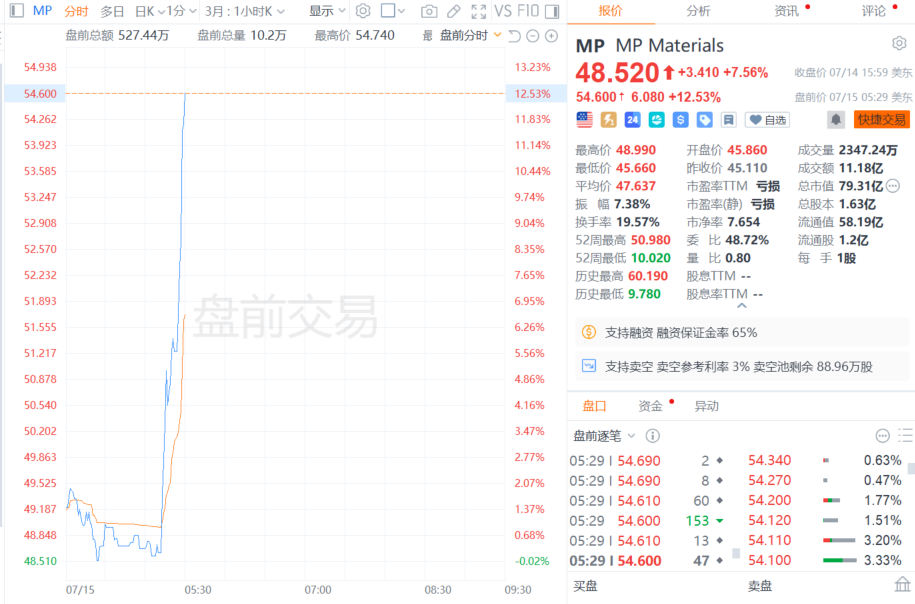 稀土生产商MP Materials美股盘前涨超12%