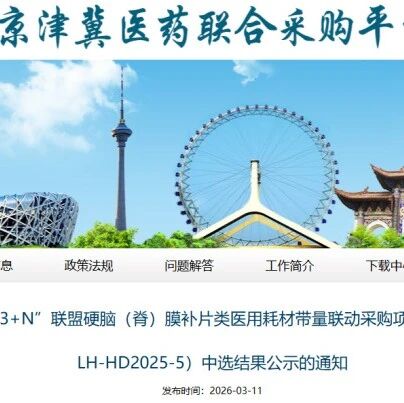 2026年3月11日, 京津冀医药联合采购平台发布两则通知,分别对 硬脑(脊)膜补片类医用耗材 和 留置针类医用耗材 带量联动采购项目的中选结果进行公 示 。 (中选结果请点击下方文字链接 查看表格) 京津冀"3+N"联盟硬脑(脊)膜补片类医用耗材带量联动采购中选结果公示表.xlsx 京津冀"3+N"联盟留置针类医用耗材带量联动采购中选结果公示表.xlsx # 思宇MedTech 内容索引 其中,《关于京津冀"3+N"联盟硬脑(脊)膜补片类医用耗材带量联动采购项目(项目编号:LH-HD2025-5)中选结果公示的通知》显示,根据此前发布的 《关于京津冀"3+N"联盟硬脑(脊)膜补片类医用耗材带量联动采购项目有关工作的通知》相关要求,现对本次项目中选结果进行公示。 同时,《关于京津冀"3+N"联盟留置针类医用耗材带量联动采购项目(项目编号:LH-HD2025-4)中选结果公示的通知》也同步发布。根据《关于开展京津 冀"3+N"联盟留置针类医用耗材带量联动采购有关工作的通知》,本次留置针类耗材集采中选结果进入公示阶段。 两项项目的公示时间均为 2026年3月12日至3月16日17时 。 重点企业与机构 ▌知名医疗 ...