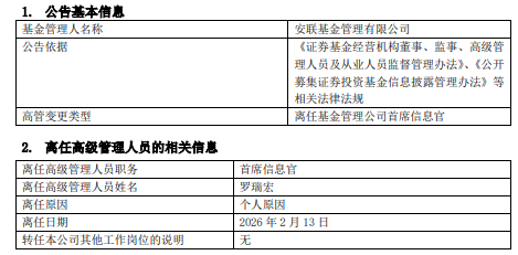 | 离任高级管理人员职务 | 首席信息官 | | --- | --- | | 离任高级管理人员姓名 | 罗瑞宏 | | 离任原因 | 个人原因 | | 离任日期 | 2026年2月13日 | | 转任本公司其他工作岗位的说明 | 无 | | i Card and Can in Can and Deal Children | | | --- | --- | | 基金管理人名称 | 安联基金管理有限公司 | | 公告依据 | 《证券基金经营机构董事、监事、高级管 | | | 理人员及从业人员监督管理办法》、《公开 | | | 募集证券投资基金信息披露管理办法》等 | | | 相关法律法规 | | 高管变更类型 | 离任基金管理公司首席信息官 | 中国经济网北京2月25日讯近日,安联基金公告,首席信息官罗瑞宏因个人原因离任。 ...