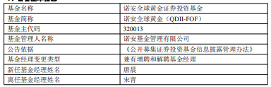 中国经济网北京2月25日讯 近日,诺安基金公告,诺安全球黄金(QDII-FOF)增聘唐晨,宋青离 任。 唐晨曾任四川英祥实业集团有限公司理财顾问,2019年10月加入诺安基金管理有限公司,历任研究 员、投资经理,现任研究部总经理助理。2022年12月起任基金经理。 诺安全球黄金成立于2011年01月13日,截至2026年02月13日,其今年来收益率为13.64%,成立来 收益率为182.41%,累计净值为2.6210元。 | 基金名称 | 诺安全球黄金证券投资基金 | | --- | --- | | 基金简称 | 诺安全球黄金(QDII-FOF) | | 基金主代码 | 320013 | | 基金管理人名称 | 诺安基金管理有限公司 | | 公告依据 | 《公开募集证券投资基金信息披露管理办法》 | | 基金经理变更类型 | 兼有增聘和解聘基金经理 | | 新任基金经理姓名 | 唐晨 | | 离任基金经理姓名 | 宋青 | (责任编辑:康博) ...