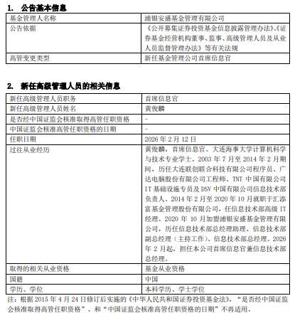中国经济网北京2月25日讯 近日,浦银安盛基金公告,任命黄俊麟为首席信息官。 黄俊麟2003年7月至2014年2月期间,历任大连联创联合科技有限公司程序员、广达电脑股份有限公 司工程师、TNT中国有限公司IT基础设施专员及DSV中国有限公司信息技术部负责人。2014年2月至 2020年10月就职于汇添富基金管理股份有限公司,任信息技术部高级IT经理。2020年10月加盟浦银安盛 基金管理有限公司,历任信息技术部总经理助理、信息技术部副总经理(主持工作)、信息技术部总经 理。2026年2月起,担任浦银安盛基金首席信息官兼信息技术部总经理。 | 新任高级管理人员职务 | 首席信息官 | | --- | --- | | 新任高级管理人员姓名 | 黄俊麟 | | 是否经中国证监会核准取得高管任职资格 | | | 中国证监会核准高管任职资格的日期 | | | 任职日期 | 2026年2月12日 | | 过往从业经历 | 黄俊麟,首席信息官。大连海事大学计算机科学 | | | 与技术专业学士。2003年7月至2014年2月期 | | | 间,历任大连联创联合科技有限公司程序员、广 | | | 达电脑股份有限公司工程师、T ...