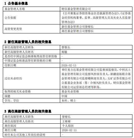 中国经济网北京2月25日讯近日,财信基金公告,任命杨敏为督察长,王彬彬离任。 | 新任高级管理人员职务 | 督察长 | | --- | --- | | 新任高级管理人员姓名 | 杨敏 | | 是否经中国证监会核准取得高管任职资格 | | | 中国证监会核准高管任职资格的日期 | | | 任职日期 | 2026-02-13 | | 过往从业经历 | 曾任易方达基金管理有限公司监察部监察员,中科沃土 基金管理有限公司监察风控部负责人,新疆前海联合基 金管理有限公司监察稽核部负责人,五矿证券有限公司 | | | 公募基金业务部(筹)合规风控负责人,财信基金管理 | | | 有限公司运营部总经理等职务。 | | 取得的相关从业资格 | 基金从业资格 | | 国籍 | 中国 | | 学历、学位 | 本科、硕士 | | 离任高级管理人员职务 | 督察长 | | --- | --- | | 离任高级管理人员姓名 | 王彬彬 | | 离任原因 | 个人原因 | | 离任日期 | 2026-02-13 | | 转任本公司其他工作岗位的说明 | | 杨敏曾任易方达基金管理有限公司监察部监察员,中科沃土基金管理有限公司监察风控部负 ...