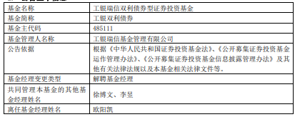 | 基金名称 | 工银瑞信双利债券型证券投资基金 | | --- | --- | | 基金间称 | 工银双利债券 | | 基金主代码 | 485111 | | 基金管理人名称 | 工银瑞信基金管理有限公司 | | 公告依据 | 根据《中华人民共和国证券投资基金法》、《公开募集证券投资基金 | | | 运作管理办法》、《公开募集证券投资基金信息披露管理办法》及其 | | | 他有关法律法规以及本基金相关法律文件等。 | | 基金经理变更类型 | 解聘基金经理 | | 共同管理本基金的其他基 | 徐博文、李昱 | | 金经理姓名 | | | 离任基金经理姓名 | 欧阳凯 | 中国经济网北京2月25日讯 近日,工银瑞信基金公告,欧阳凯离任工银双利债券。 工银瑞信双利债券A/B成立于2010年08月16日,截至2026年02月24日,其今年来收益率为2.44%、 2.34%,成立来收益率为154.99%、139.62%,累计净值为2.3940元、2.2680元。 欧阳凯曾任中海基金管理有限公司基金经理,2010年加入工银瑞信,现任固定收益投资总监、投资 决策委员会成员。 (责任编辑:康博) ...