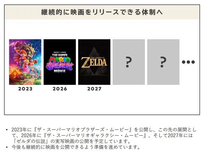 据外媒Insider Gaming日前报道,影视化已成为任天堂未来的重要战略方向。 根据任天堂新一期财报说明会公布的资料显示,公司目前正推进多个基于旗下IP改编的电影项目,这些作品处于不同制作阶段,将在2027年《塞尔达传 说》真人电影上映后陆续推出。 与大多数游戏厂商更偏授权型的合作模式不同,任天堂计划全程深度参与这些电影,从制作到投资都会亲自把关。《超级马力欧兄弟大电影》全球超 13 亿美元的票房成绩让任天堂确信,创作者亲自参与是确保改编质量的关键前提。 而就在10月底,有外媒披露照明娱乐与任天堂正计划共同打造"马力欧宇宙",包括《森喜刚》《路易吉洋馆》《碧姬公主》等多部衍生电影都在积极开发 中,最终目标是推出一部汇聚任天堂全明星角色的《任天堂明星大乱斗》电影。 可以说,任天堂的决心不是偶然,而是时代趋势的一个缩影。 游改影加速走向主流 在过去相当长的一段时间里,游戏改编影视更多被视为一种粉丝向内容开发尝试,其成功与否充满偶然性,产业态势尚未稳定。 然而近几年,这种不确定性正在消失。从动画到真人,从电影到剧集,游戏改编影视正在快速走向主流体系,并形成完整的项目开发、内容生产与全球发 行链路。 典型案例显示 ...