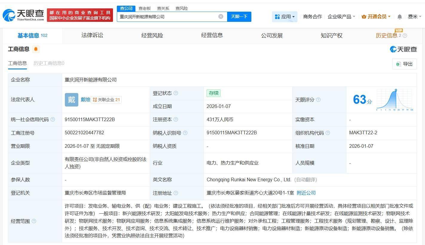 | | 皇公司 都在用的商业商间丁目 | 音老板 商关系 音风险 | | | | --- | --- | --- | --- | --- | | | 家中小企业发展子其余旗下机构 | 重庆润开新能源有限公司 | 8 天眼一下 脂 应用 ▼ | 商务合作 | | 基本信息 102 | 法律诉讼 | 经营风险 | 经营信息 公司发展 | 知 | | 工商信息 ● | | | | | | 工商信息 历史丁商信息0 | | | | | | 企业名称 | 重庆润开新能源有限公司 | | | | | 法定代表人 | 載 载维 器关联企业 21 | 登记状态 2 | 存续 | 天眼评分 2 | | | | 成立日期 | 2026-01-07 | | | 统一社会信用代码 2 | 91500115MAK3TT222B | 注册资本 2 | 431万人民币 | 实缴资本 | | 工商注册号 | 500221020447782 | 纳税人识别号 0 | 91500115MAK3TT222B | 组织机构代码( | | 营业期限 | 2026-01-07 至 无固定期限 | 纳税人资质 | 1 | 核准目期 | | 北小菜品 | ...