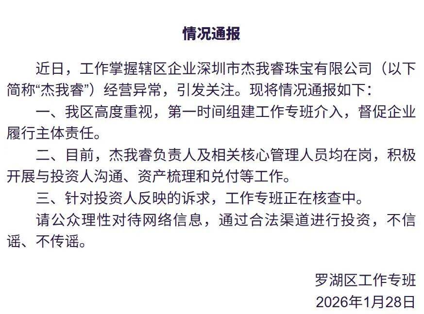智通财经记者 谢煜楠 深圳水贝黄金预定价平台"杰我睿"出现兑付困难。 编辑:忻燕 素材来源:相关人士 责任编辑:周琦 校对:施鋆 公开信息显示,"杰我睿"由深圳水贝黄金原料交易商深圳市杰我睿珠宝有限公司控制,近年来业务逐步转向贵金属零售,并 向散户开放黄金预定价交易。 1月28日,智通财经从罗湖区获悉,罗湖区工作掌握辖区企业"杰我睿"经营异常,第一时间组建工作专班介入,督促企业履 行主体责任。 目前,"杰我睿"负责人及相关核心管理人员均在岗,积极开展与投资人沟通、资产梳理和兑付等工作。 本期编辑 邹姗 ...