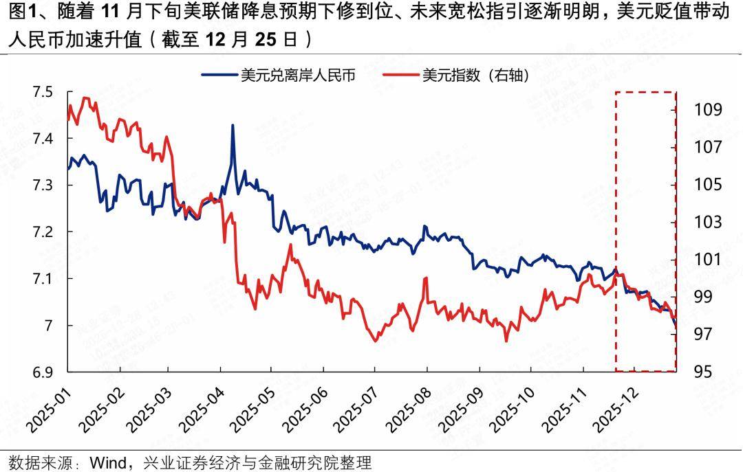 来源:兴证策略张启尧团队 引言:近期人民币加速走强,新一轮人民币升值周期启动愈发成为市场共识。为何近期人民币升值加速?后续人民币升值还有哪些支撑,如何影响市场? 历史上的人民币升值周期,A股与港股如何表现?如何把握新一轮人民币升值周期的配置机会?详见报告: 一、为何近期人民币升值加速? 近期人民币加速升值引发市场关注。我们认为,背后主要反映的是美元再度走弱叠加年末"结汇潮"带动下,人民币相对其他非美货币的"补涨",与市场对 人民币升值的一致预期形成共振。 首先,随着11月下旬市场美联储降息预期下修到位、未来宽松指引逐渐明朗,美元再度走弱带动人民币加速升值。10月美国政府停摆对于TGA账户的"抽 水"、叠加数据空窗期下美联储降息表态趋于谨慎,曾一度引发市场流动性预期收紧,进而带动美元指数持续走强,成为当时美元兑人民币汇率继续下行 的掣肘。而11月下旬以来,随着美国政府"开门"后流动性释放、12月美联储降息并开启技术性扩表,显著改善此前偏紧的流动性环境,叠加关键数据验证 以及特朗普对于"影子主席"的表态进一步为后续宽松打开想象空间,美元指数见顶回落、快速下行破98,是近期人民币加速升值的重要推动。 二、后续人民币 ...