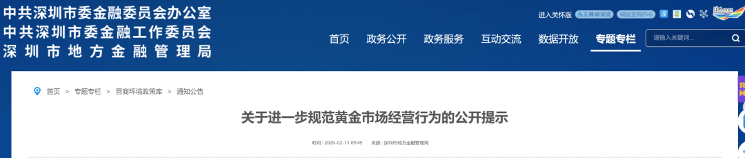 为进一步规范深圳市黄金市场经营秩序,防范化解市场风险,保护消费者合法权益,促进黄金市场健康发展,2月13日,深圳市地方金融管理局、中国人 民银行深圳市分行等10部门发布关于进一步规范黄金市场经营行为的公开提示。 其中提出:企业不得违规开展黄金预定价交易、杠杆交易、延期交易等非法黄金交易活动,以及以黄金托管、租赁、回购等为名、承诺"保本付息"固定收 益回报的非法集资行为。 具体原文如下 ▽ 关于进一步规范黄金市场经营行为的公开提示 为进一步规范深圳市黄金市场经营秩序,防范化解市场风险,保护消费者合法权益,促进黄金市场健康发展,根据《中华人民共和国刑法》、《中华人民 共和国中国人民银行法》、《中华人民共和国期货和衍生品法》、《中华人民共和国反洗钱法》、《中华人民共和国金银管理条例》、《防范和处置非法 集资条例》、《国务院关于清理整顿各类交易场所切实防范金融风险的决定》等法律法规和有关规定,现就企业、个人、金融机构及非银行支付机构从事 黄金业务禁止性行为公开提示如下: 一、企业黄金业务禁止性行为 1.不得违规开展黄金预定价交易、杠杆交易、延期交易等非法黄金交易活动,如通过微信群或小程序、APP、网站等互联网平台,以 ...