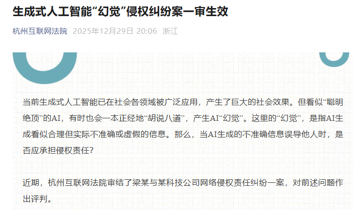 我国首例AI幻觉引发的侵权纠纷案宣判,原告索赔9999元被驳回