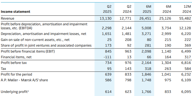 马士基在报告中指出,尽管面临前所未有的地缘政治波动,公司仍专注于运营改善,持续的红海危机预 计将持续全年,这在一定程度上缓解了行业船舶过剩问题。 全球需求分化:美国疲软,其他地区强劲 值得注意的是,马士基上调全球集装箱市场增长预期至2%至4%,此前预期为-1%至4%。 这一调整主要基于美国以外地区展现的需求韧性。马士基在报告中明确指出,"北美进口的收缩被欧 洲、拉丁美洲、西亚和非洲强劲的进口增长所抵消。"这种地区间需求分化为公司整体业绩提供了支 撑。 全球航运巨头马士基Q2业绩超预期,美国以外地区需求强劲。公司上调2025年财务展望,预计今年全 球集装箱市场将增长2%至4%,较此前预期大幅提升。 马士基CEO Vincent Clerc在接受采访时表示: 周四财报数据显示,马士基第二季度营收达131.3亿美元,超出市场预期的125.7亿美元。息税折旧摊销 前利润(EBITDA)为23亿美元,同样高于市场预期的19.9亿美元。 | | Q2 | Q2 | 6M | 6M | 12M | | --- | --- | --- | --- | --- | --- | | Income statement | 2025 ...