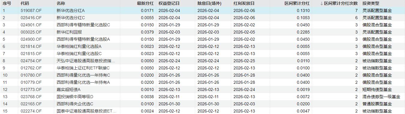 Core Viewpoint - The enthusiasm for dividend distribution among public funds is increasing significantly in 2026, with various types of equity funds, including quantitative funds, actively participating in dividend payouts [1][2]. Group 1: Dividend Distribution Trends - Multiple public funds, including those from Invesco Great Wall, Morgan, and Cathay, announced dividend distributions for their funds [1][2]. - As of February 25, 2026, some funds have already distributed dividends up to 7 times this year, with quantitative funds being particularly active in this regard [2][4]. - The trend of increasing dividend distributions is seen as a strategy by fund managers to enhance the long-term attractiveness of their products amid challenges in fundraising and regulatory compliance [1][4]. Group 2: Performance of Dividend Funds - Wind statistics indicate that the top funds in terms of dividend distribution frequency are primarily active equity funds, with a notable presence of quantitative funds [4]. - The average return rate for dividend-themed funds since the beginning of 2026 has reached 4.47%, surpassing the growth of the Shanghai Composite Index [7]. - Specific funds, such as Huashang Hong Kong Stock Connect Value Return, have achieved a return rate of 15.93% year-to-date, while several others have exceeded 10% [7]. Group 3: Market Dynamics and Investor Behavior - The demand for dividend-paying assets is driven by the need for stable cash flow, especially among risk-averse institutional investors [7][8]. - The growth in dividend distributions is supported by the expansion of passive products and the increasing scale of broad-based ETFs, which enhance the dividend mechanism [8]. - Fund managers are focusing on creating products that prioritize investor benefits, with dividends becoming a key factor in improving the holding experience [8].