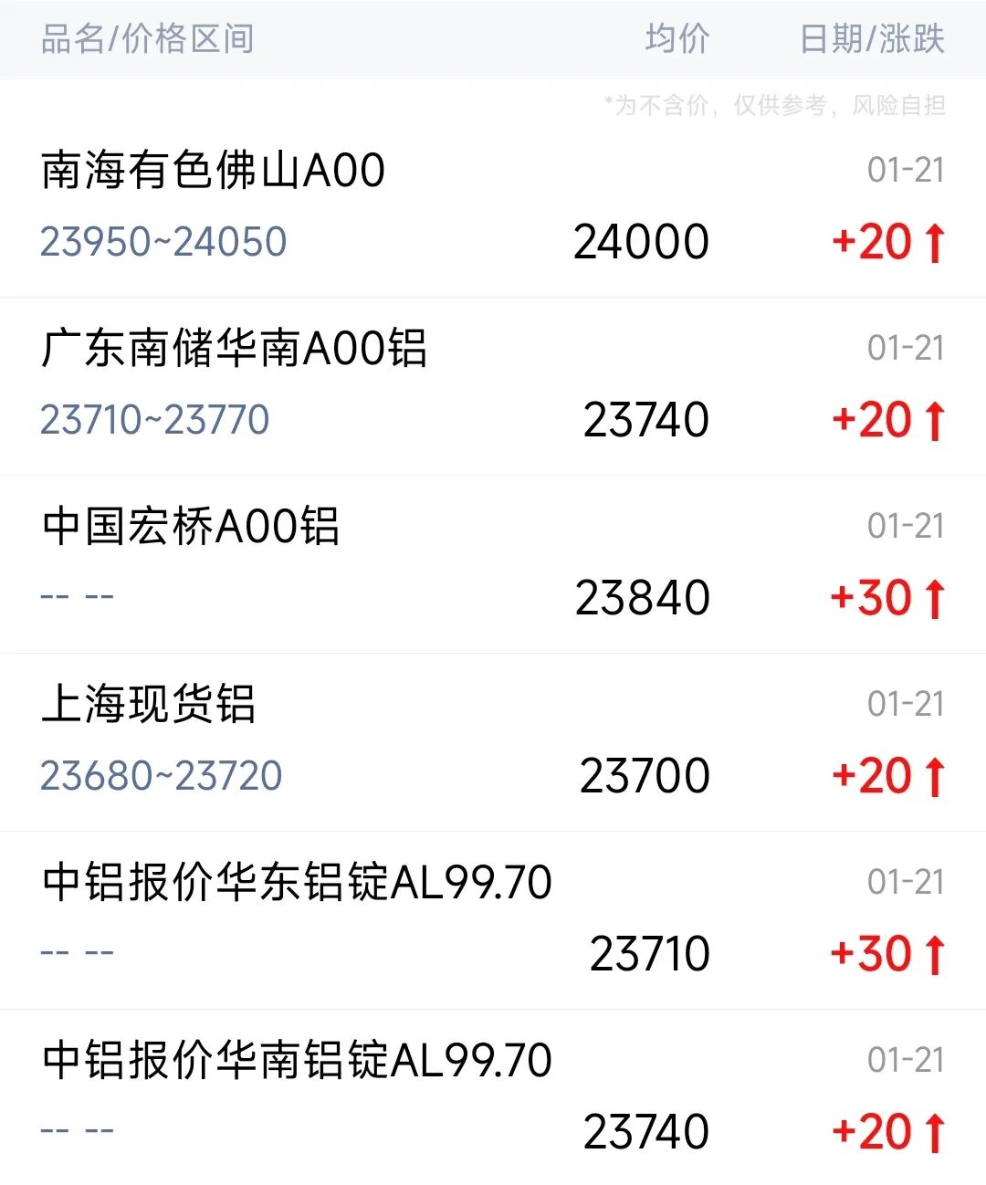 21日南海有色铝23950~24050均价24000涨20,不含22070~22170均价22120涨20 21日南海有色铝23950~24050均价24000涨20,不含22070~22170均价22120涨20 | 品名/价格区间 | 均价 | 日期/涨跌 | | --- | --- | --- | | | | *为不含价,仅供参考,风险自担 | | 南海有色佛山A00 | | 01-21 | | 23950~24050 | 24000 | +20 ↑ | | 广东南储华南A00铝 | | 01-21 | | 23710~23770 | 23740 | +20 ↑ | | 中国宏桥A00铝 | | 01-21 | | | 23840 | +30 t | | 上海现货铝 | | 01-21 | | 23680~23720 | 23700 | +20 ↑ | | 中铝报价华东铝锭AL99.70 | | 01-21 | | | 23710 | +30 + | | 中铝报价华南铝锭AL99.70 | | 01-21 | | | 23740 | +20 ↑ | 山西科源碳素有限公司 石墨异形件 || 石墨转子 氮化 ...