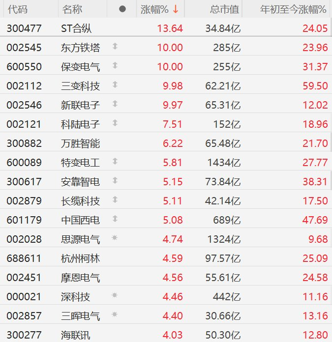 Core Viewpoint - The A-share market has seen a significant rise in smart grid concept stocks, with several companies reaching their daily limit up, indicating strong investor interest in this sector [1]. Group 1: Stock Performance - Dongfang Tower (东方铁塔) and Baobian Electric (保变电气) both increased by 10%, while Sanbian Technology (三变科技) rose by 9.98%, reflecting a robust performance among smart grid stocks [1][2]. - New Link Electronics (新联电子) previously hit the limit up, and other companies such as China West Electric (中国西电) and Tebian Electric (特变电工) also experienced gains, showcasing a broad rally in the sector [1]. Group 2: Market Capitalization and Year-to-Date Performance - The total market capitalization of Dongfang Tower is 285 billion, with a year-to-date increase of 23.96% [2]. - Baobian Electric has a market cap of 255 billion and a year-to-date increase of 31.37% [2]. - Sanbian Technology's market cap stands at 62.21 billion, with a remarkable year-to-date increase of 59.50% [2]. - China West Electric has a market cap of 689 billion and a year-to-date increase of 47.69%, indicating strong market confidence [2].