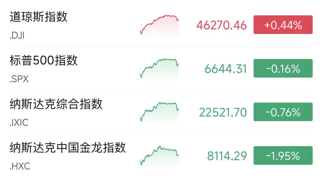 Market Overview - The U.S. stock market closed mixed on October 14, with the Dow Jones Industrial Average rising by 0.44% to 46,270.46 points, while the S&P 500 fell by 0.16% to 6,644.31 points, and the Nasdaq Composite dropped by 0.76% to 22,521.70 points [2][3]. Sector Performance - Financial stocks mostly rose, with Wells Fargo surging over 7%, Citigroup increasing nearly 4%, and Bank of America rising over 2%. However, Goldman Sachs fell by over 2%, and JPMorgan Chase dropped more than 1% [7]. - Energy stocks showed mixed results, with Schlumberger up nearly 1%, while ConocoPhillips and Occidental Petroleum experienced slight declines [8]. - Airline stocks saw significant gains, with Delta Air Lines and Southwest Airlines both rising over 4%, and American Airlines and United Airlines increasing nearly 4% [9]. Semiconductor Sector - The Philadelphia Semiconductor Index experienced a late-session drop, closing down 2.28%. Notable declines included Nvidia and Intel, both falling over 4%, along with Micron Technology and Broadcom, which also saw declines exceeding 3% [3][6]. Chinese Stocks - Chinese stocks listed in the U.S. faced overall declines, with the Nasdaq Golden Dragon China Index falling by 1.95%. Specific declines included Zai Lab dropping nearly 6%, and several other companies like NIO and Baidu falling over 4% [10]. However, some companies like Canadian Solar and Daqo New Energy saw gains, with increases of nearly 11% and over 4%, respectively [10].
