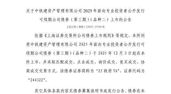 12月2日,上交所发布关于中铁建资产管理有限公司2025年面向专业投资者公开发行可续期公司债券 (第三期)(品种二)上市的公告。 来源:市场资讯 依据《上海证券交易所公司债券上市规则》等规定,上交所同意中铁建资产管理有限公司2025年面向专 业投资者公开发行可续期公司债券(第三期)(品种二)于2025年12月3日起在上交所上市,并采取匹 配成交、点击成交、询价成交、竞买成交、协商成交交易方式。该债券证券简称为"25铁资Y6",证券 代码为"244322"。 ...