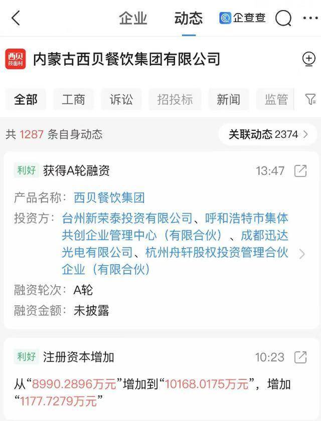 闭店风波后、西贝获新荣记创始人等多方投资,注册资本增至1亿元