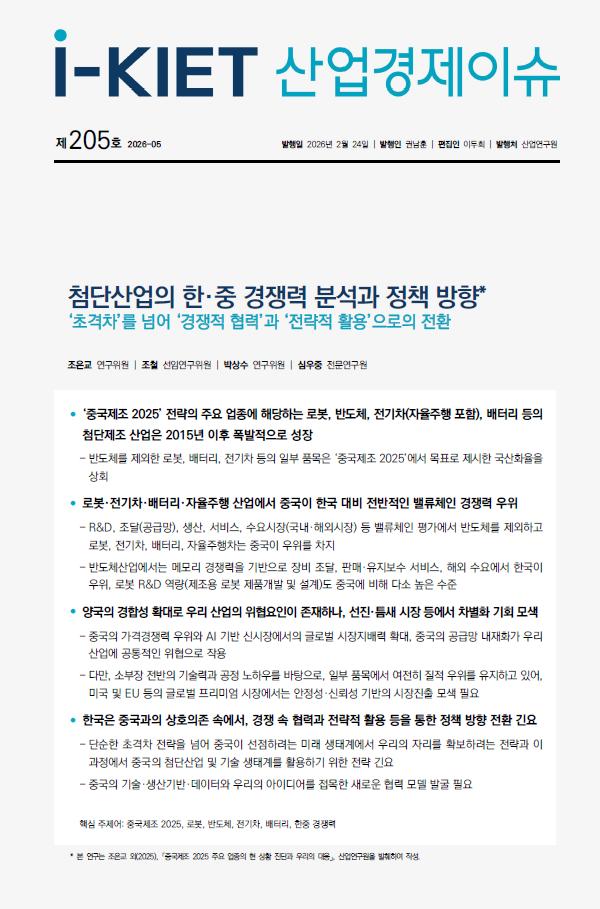 昨天,韩国国家级国策智库——韩国产业研究院( Korea Institute for Industrial Economics and Trade, KIET)发布了《韩中尖端产业竞争力分析及政策方 向》报告,在韩国产业界引发广泛关注与震动。 韩国产业研究院是韩国唯一专注于产业与贸易交叉领域研究的国家级政策研究机构,自1976年由韩国政府设立以来,始终以助力韩国产业发展、提升国家 竞争力为核心使命,是韩国产业政策制定的核心智囊支撑。 这家韩国顶级国策研究机构经过半年多的研究分析,不得不承认在物理AI时代,中国机器人、半导体、电动汽车、电池等尖端制造业快速增长,已经对 韩国形成了明显优势。 KIET的报告封面(图源:KIET) 而对于韩国一直引以为傲的半导体产业,韩国产业研究院的评估结论是中国两国实力相当。这主要是因为韩国虽然在存储器半导体领域拥有世界最高水平 的竞争力,但 中国 在AI芯片、IGBT等非存储器领域却拥有相对较高的竞争力,多数专家认为中国在AI芯片设计等领域具有压倒性优势,甚至在无晶圆厂 制造、封装等环节也具备技术、价格、基础设施等方面的领先实力。 报告直言,"中国追赶韩国的时代已然终结,如今轮 ...