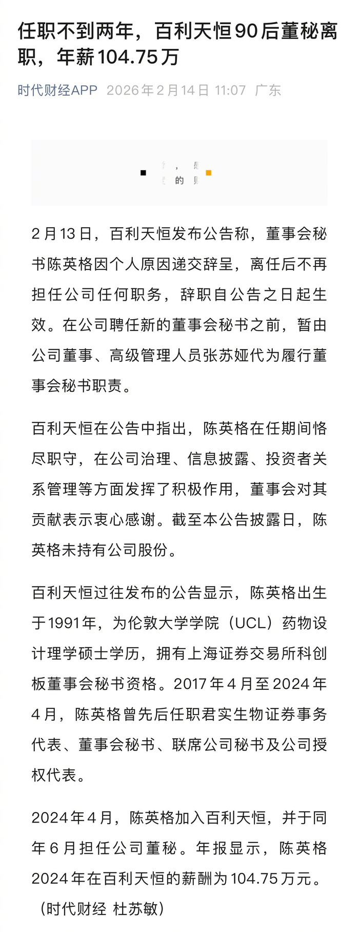 百利天恒90后董秘陈英格离职,年薪104万任职不到两年