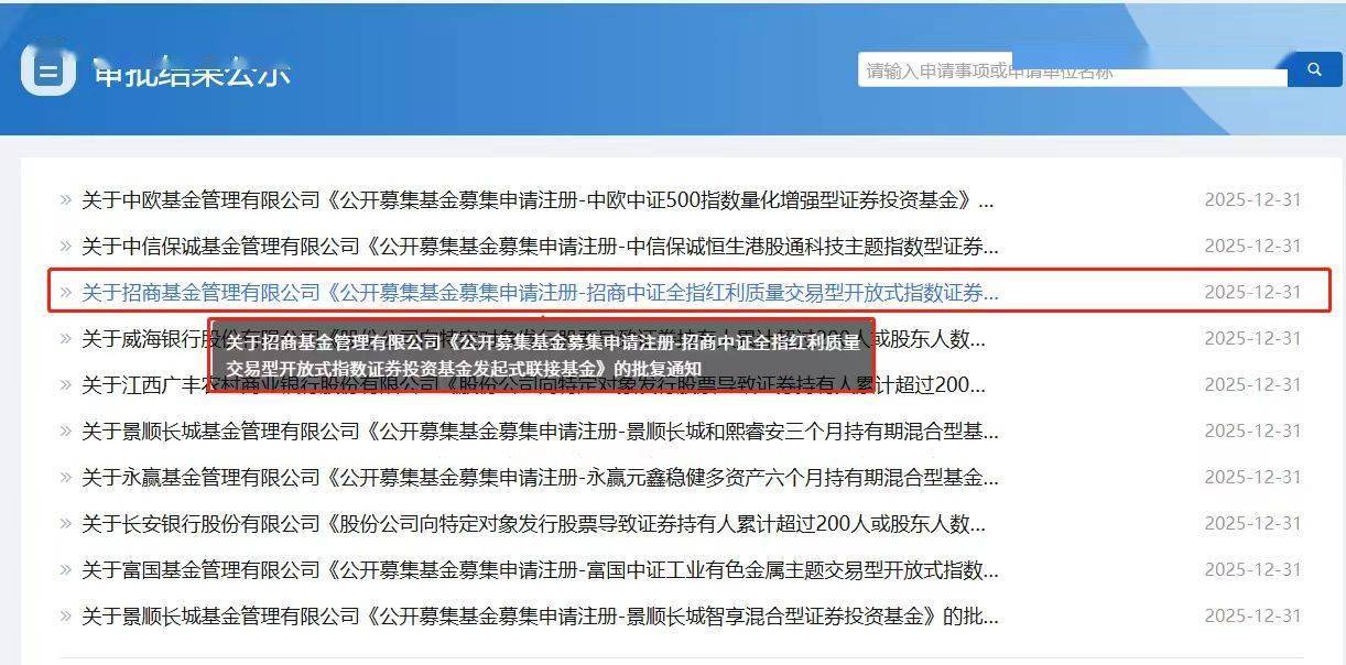 与此同时,深交所于1月9日发布公告,正式将中证红利质量ETF(159209)纳入最新一期融资融券标的名单,自2026年1月12日起施行。这一举措将显著提 升该产品的市场流动性和资金参与灵活性。作为一项结合"高股息"与"高盈利质量"的创新策略,该ETF及其联接基金的"双通道"完善,为投资者提供了更便 捷、多元的配置工具。 证监会及深交所近日为红利质量投资赛道带来双重利好。根据公开信息,招商中证全指红利质量ETF发起式联接基金已于2025年12月31日正式获得证监会批 准,这标志着目前两市唯一跟踪中证全指红利质量指数的场内工具——中证红利质量ETF(159209),正式打通场外投资渠道。 | = 中TU-DRA | | --- | | » 关于中欧基金管理有限公司《公开募集基金募集申请注册-中欧中证500指数量化增强型证券投资基金》... | | 》关于中信保诚基金管理有限公司《公开募集基金募集申请注册-中信保诚恒生港股通科技主题指数型证券... | | » 关于招商基金管理有限公司《公开募集基金募集申请注册-招商中证全指红利质量交易型开放式指数证券 ... | | > 关于威海银行股份有限格属分管理治假公司《公 ...