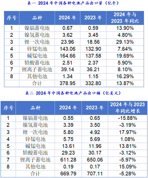 智通财经APP获悉,中国化学与物理电源行业协会行业发布《2024年中国电池产品出口统计分析》。数据显示,2024年中国各种电池品种出口总量为 378.95亿个,2023年出口总量为332.80亿个,同比增长13.87%。2024年中国各种电池品种出口额为669.79亿美元,2023年出口额为707.11亿美元,同比减 少5.28%。其中,锂离子蓄电池出口额占91.3%,铅酸蓄电池出口额占4.4%,锌锰/碱锰电池出口额占2.9%,镍氢/镍镉蓄电池出口额占0.6%。 | 序号 | 品种 | 2024 年 | 2023 年 | 2024 年与 2023 年同比 | | --- | --- | --- | --- | --- | | 1 | 镇铜蓄电池 | 0.67 | 0.59 | 13.90% | | 2 | 镍氢蓄电池 | 3.62 | 3.45 | 4.80% | | 3 | 锂一次电池 | 23.96 | 18.56 | 29.13% | | ব | 锌锰电池 | 143.06 | 132.90 | 7.64% | | 5 | 碱锰电池 | 164.66 | 137.58 | 19.69% | | િ | ...