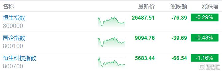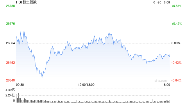 1月20日,受关税以及格陵兰岛紧张局势影响,港股三大指数再度收跌,恒生科技指数跌幅相对较大,最终下跌1.16%,恒生指数、国企指数分别下跌0.29% 及0.43%,恒指跌破26500点关口。 | 名称 | | 最新价 | 涨跌额 | 涨跌幅 | | --- | --- | --- | --- | --- | | 恒生指数 | | 26487.51 | -76.39 | -0.29% | | 800000 | on m | | | | | 国企指数 | | 9094.76 | -39.69 | -0.43% | | 800100 | | | | | | 恒生科技指数 | | 5683.44 | -66.54 | -1.16% | | 800700 | | | | G H P C | 盘面上,大型科技股多数继续走低,尤其是小米跌近3%再刷阶段新低,腾讯、美团跌超1%;商业航空、汽车股、苹果概念股板块跌幅居前,生物医药股继 续跌势,军工股、半导体股等热门股多数低迷。另一方面,地缘政治紧张国际金价再创新高,黄金股带领有色金属股上涨;今年春运民航旅客运输量有望创 历史新高,三大航空股领衔航空板块上涨;内房股、物管股、建 ...