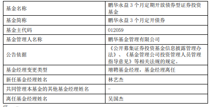 鹏华永益3个月定开债券增聘林艺杰