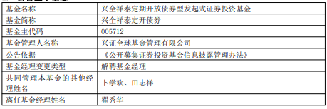 | 基金名称 | 兴全祥泰定期开放债券型发起式证券投资基金 | | --- | --- | | 基金简称 | 兴全祥泰定开债券 | | 基金主代码 | 005712 | | 基金管理人名称 | 兴证全球基金管理有限公司 | | 公告依据 | 《公开募集证券投资基金信息披露管理办法》 | | 来令经理变更类型 | 解聘基金经理 | | 共同管理本基金的其他经 | 卜学欢、田志祥 | | 理姓名 | | | 离任基金经理姓名 | 翟秀生 | (责任编辑:康博) 翟秀华历任毕马威华振会计师事务所审计,泰信基金管理有限公司交易总监助理,兴全基金管理有 限公司研究员兼基金经理助理,现任基金经理。 中国经济网北京10月29日讯 今日,兴证全球基金公告,翟秀华离任兴全祥泰定开债券。 兴全祥泰定开债券成立于2018年3月16日,截至2025年10月28日,其今年来收益率为1.41%,成立 来收益率为43.15%,累计净值为1.3848元。 ...
