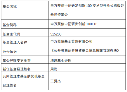 | 基金名称 | 申万菱信中证研发创新 100 交易型开放式指数证 | | --- | --- | | | 券投资基金 | | 基金简称 | 申万菱信中证研发创新 100ETF | | 基金主代码 | 515200 | | 基金管理人名称 | 申万菱信基金管理有限公司 | | 公告依据 | 《公开募集证券投资基金信息披露管理办法》 | | 基金经理变更类型 | 增聘基金经理 | | 新任基金经理姓名 | 周润 | | 共同管理本基金的其他基金 | 王雷杰 | | 经理姓名 | | 中国经济网北京10月29日讯今日,申万菱信基金公告,申万菱信中证研发创新100ETF、申万菱信中证 研发创新100ETF联接增聘周润。 周润2015年起从事金融相关工作,2015年8月加入申万菱信基金管理有限公司,曾任数量研究岗,现任 基金经理,兼任投资经理。 申万菱信中证研发创新100ETF成立于2019年10月25日,截至2025年10月28日,其今年来收益率为 45.09%,成立来收益率为119.88%,累计净值为2.1984元。 申万菱信中证研发创新100ETF联接A/C成立于2019年11月21日,截至2025年10月28 ...
